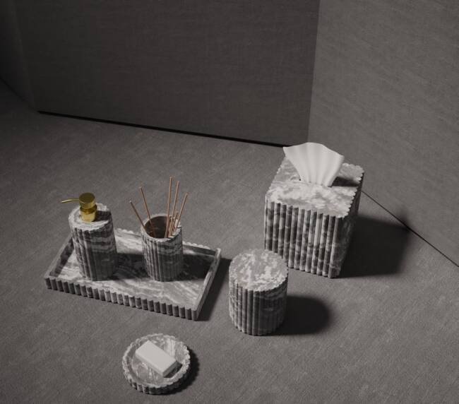 Crafted from Grigio Verde marble, these bathroom accessories bring a refined balance of sculptural form and everyday function. The natural depth and intricate patterning of the stone create a calm, grounded character, while the handcrafted detailing adds a quiet touch of luxury. Designed to elevate daily routines, each piece blends aesthetic softness with timeless practicality.