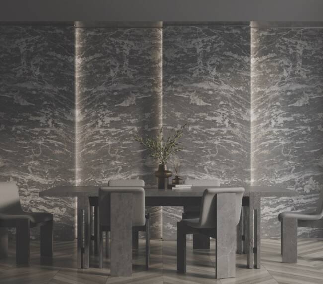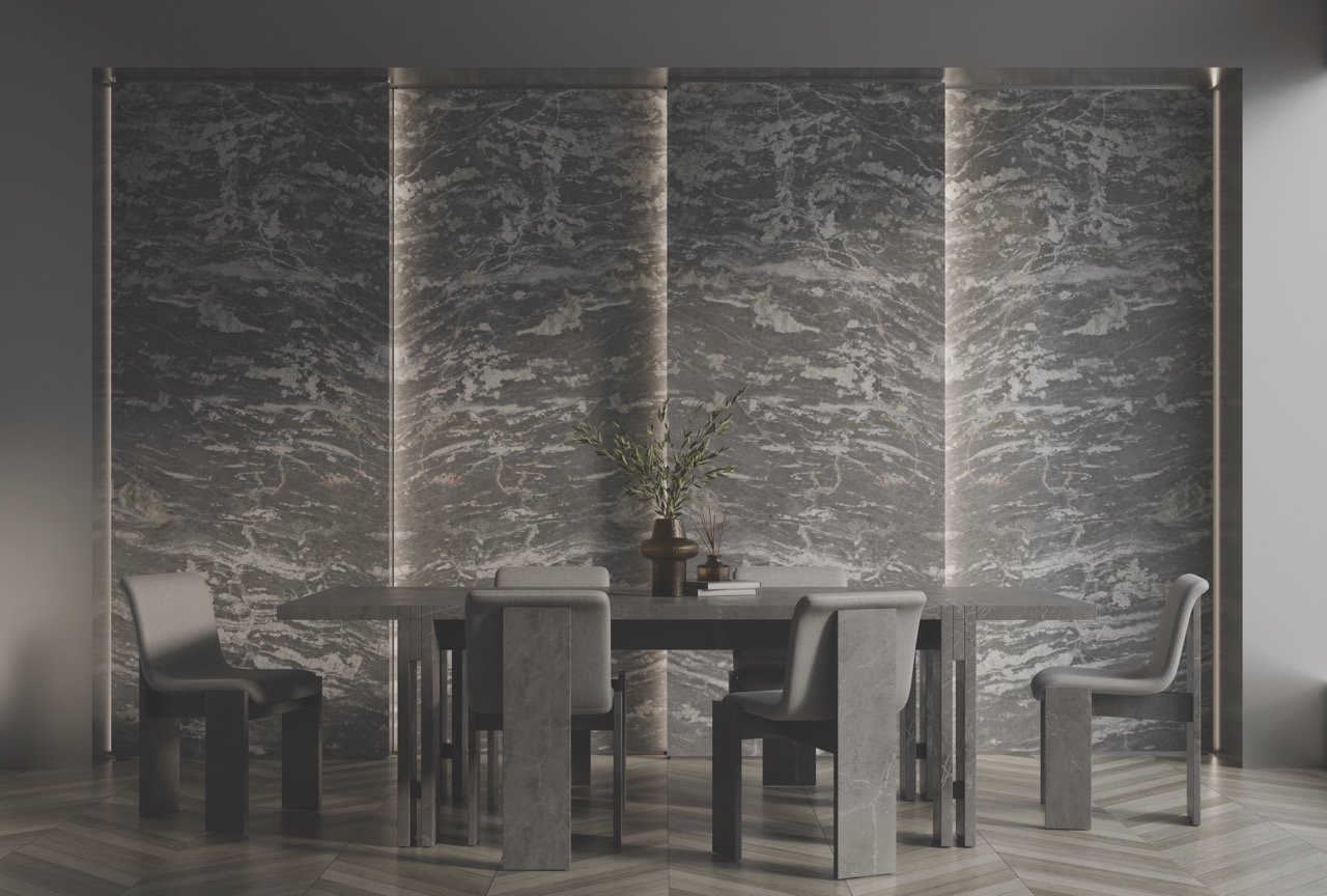 Grigio Verde captures the quiet strength of nature in motion, where deep grey tones meet soft green undertones to form a fluid, organic rhythm. The marble’s intricate veining evokes the serenity of stone shaped by water and time, lending depth and character to contemporary interiors. Both grounding and graceful, it brings a sense of composure and natural sophistication to architectural spaces.
